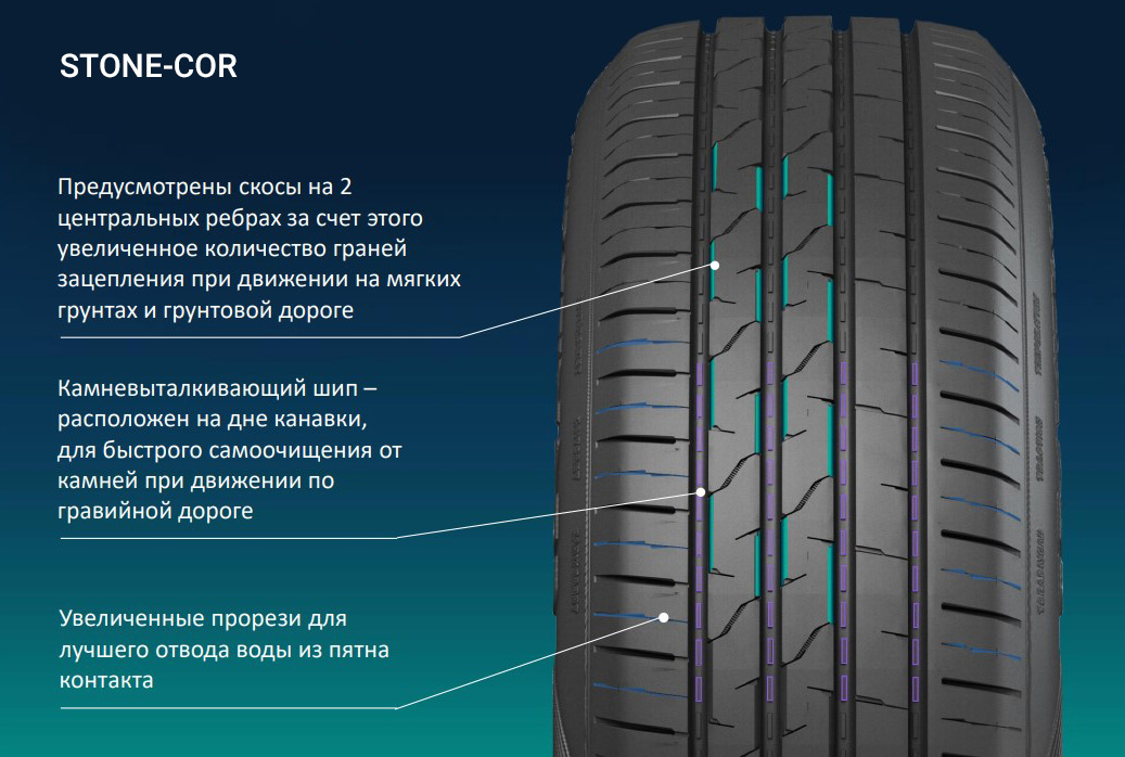 Два центральных ребра оснащены особыми скосами, которые придают дополнительный запас сцепления на рыхлых покрытиях и проселочных дорогах. Широкие продольные канавки дополнены резиновыми шипами-камнеудалителями, предназначенными для очистки протектора от острых камней и гравия. За счет чего снижается риск повреждения шины. Плечевые шашки разделены увеличенными поперечными прорезями для усиления дренажного эффекта на мокром покрытии.
